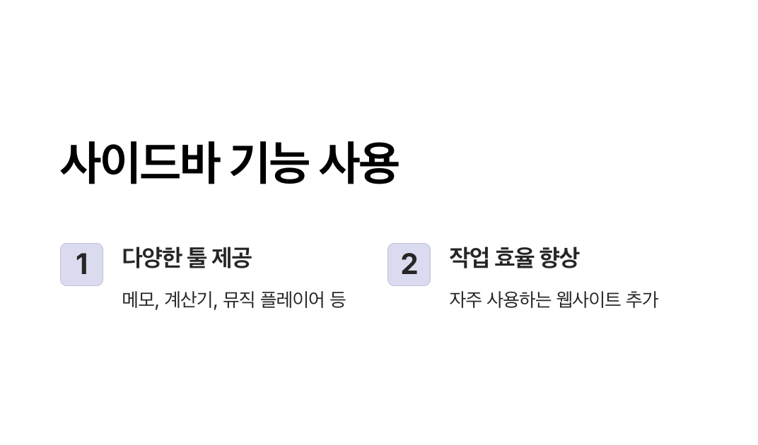 - 사이드바는 브라우저 좌측에 위치하며 메모, 계산기, 뮤직 플레이어 등 다양한 툴을 제공합니다.