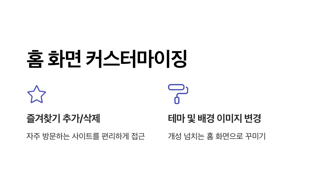 - 홈 화면에 자주 사용하는 사이트를 추가하거나 필요 없는 아이콘은 삭제할 수 있습니다.