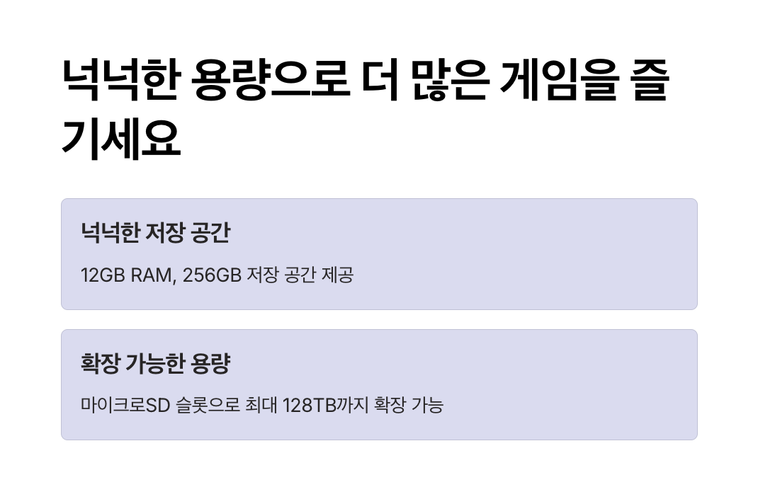 스위치2는 기본 256GB UFS 3.1 저장 공간을 제공하며, 이는 기존 스위치 OLED 모델의 64GB보다 4배나 많습니다. 이 외에도 마이크로SD 익스프레스 카드 슬롯을 통해 최대 128TB까지 확장이 가능하며, 대용량 게임이나 DLC를 저장하는 데 제약이 없습니다.
