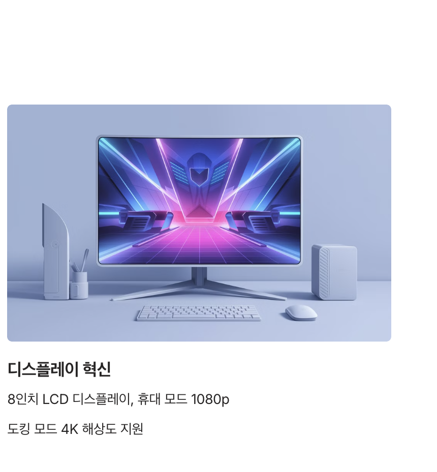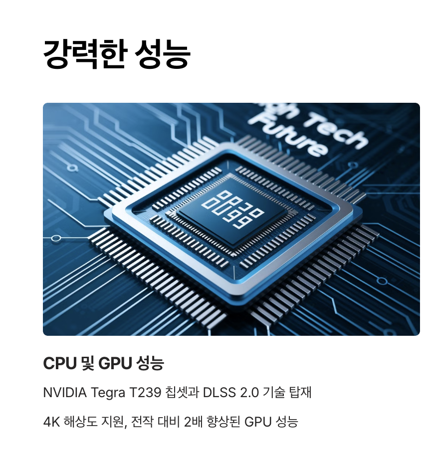 4K 해상도 출력과 8인치 디스플레이는 이전 모델에 비해 화면 몰입감을 크게 높였습니다. DLSS 기술은 고해상도와 프레임 안정성을 동시에 제공해 시각적 경험을 향상시킵니다.