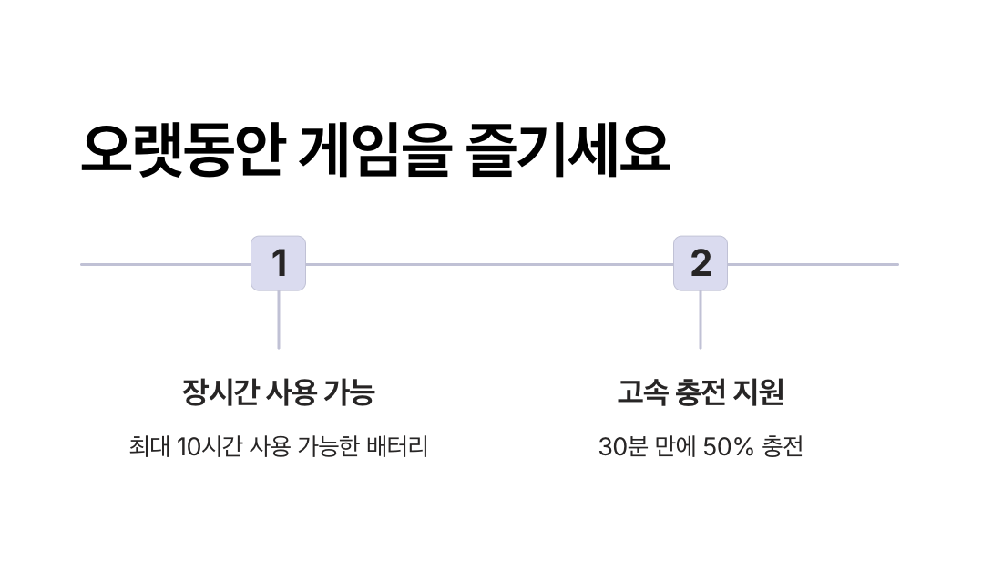 USB-C 기반의 고속 충전 기능을 통해 30분 만에 약 50% 충전이 가능하며, 완전 충전까지는 약 1시간 30분이 소요됩니다. 장시간 이동 중에도 배터리 부족에 대한 걱정을 덜어줍니다.