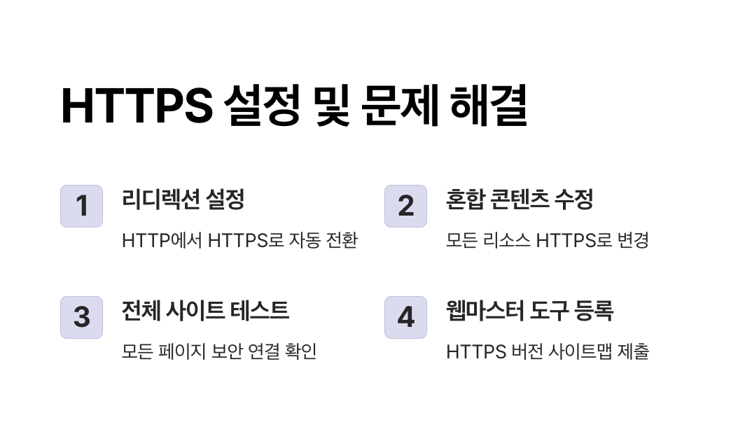 - A4. 웹사이트가 HTTPS로 자동 연결되지 않는 경우, .htaccess 파일(Apache) 또는 Nginx 설정 파일에서 HTTPS 강제 리디렉션을 적용해야 합니다. 또한, 혼합 콘텐츠(Mixed Content) 오류가 있는지 확인하여 모든 리소스를 HTTPS로 로드하도록 수정해야 합니다.
