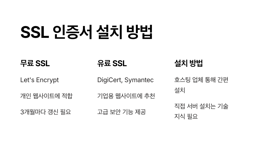 | 무료 SSL (Let's Encrypt) | 자동 발급, 무료 제공 | 중급 | 개인 블로그, 중소 웹사이트 |