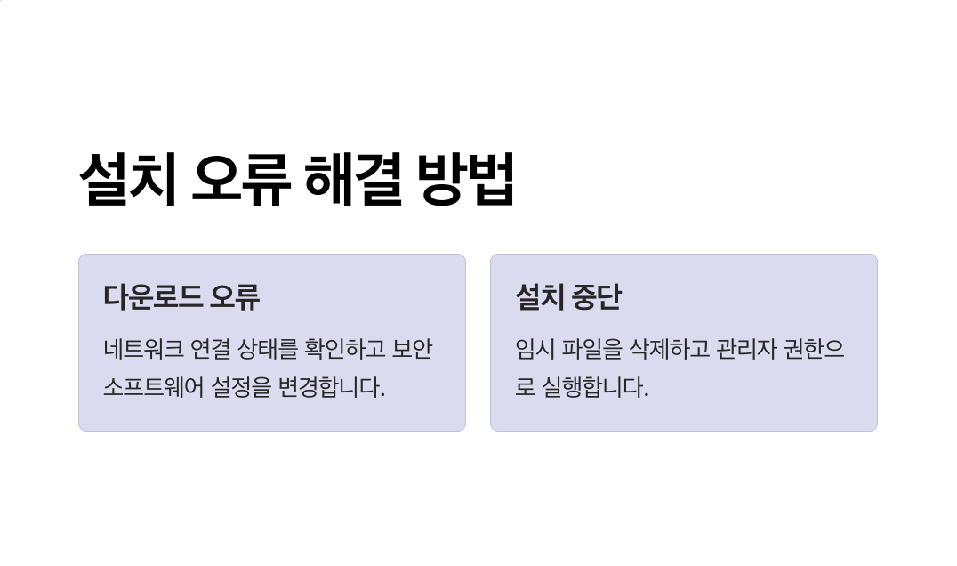 바이러스 백신이나 방화벽이 설치 파일을 차단할 수 있습니다. 일시적으로 비활성화한 뒤 설치를 시도하세요.