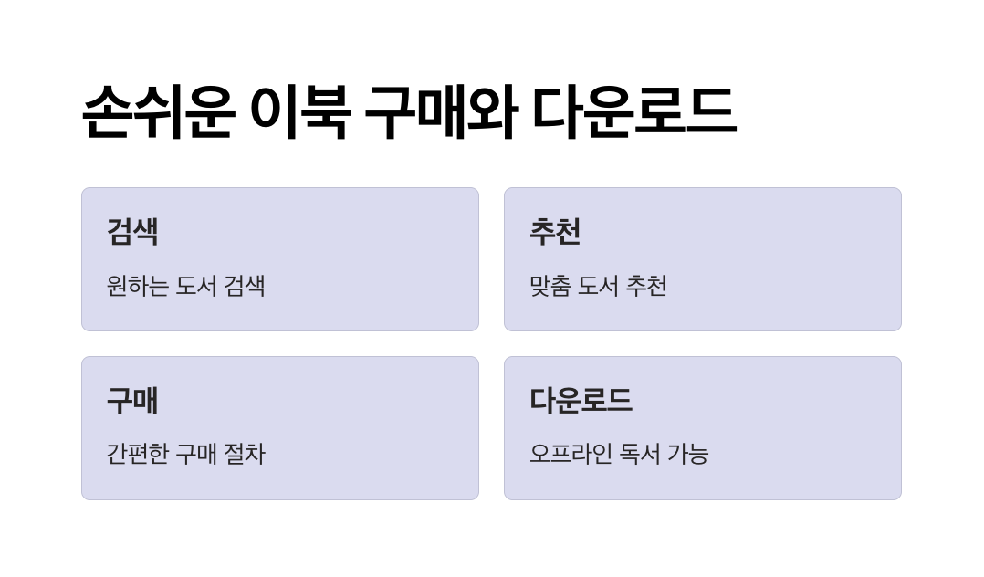 - 다운로드된 도서는 오프라인 상태에서도 언제든지 읽기 가능하며, 기기 간 동기화되어 중단했던 부분부터 이어서 읽을 수 있습니다.