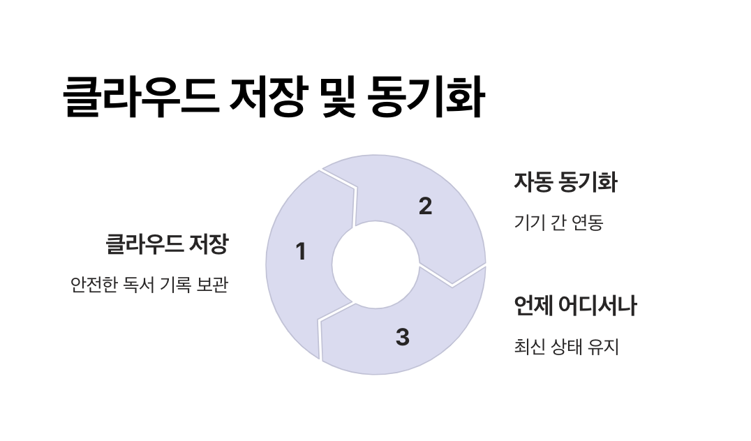 특히 클라우드 동기화 기능을 활용하면 스마트폰, 태블릿, PC 등 다양한 기기에서 언제든지 같은 페이지에서 독서를 이어갈 수 있습니다. 또 독서 노트를 사용해 중요한 부분을 정리하고 복습하면 학습이나 자기 계발에 큰 도움이 될 수 있습니다.