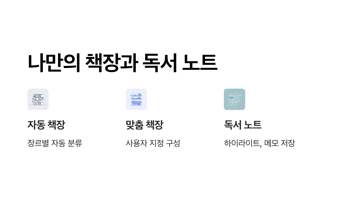- 사용자 지정 책장: 예를 들어, "비즈니스 서적", "여행 가이드", "소설" 등으로 책장을 커스터마이징하여 체계적으로 관리할 수 있습니다.