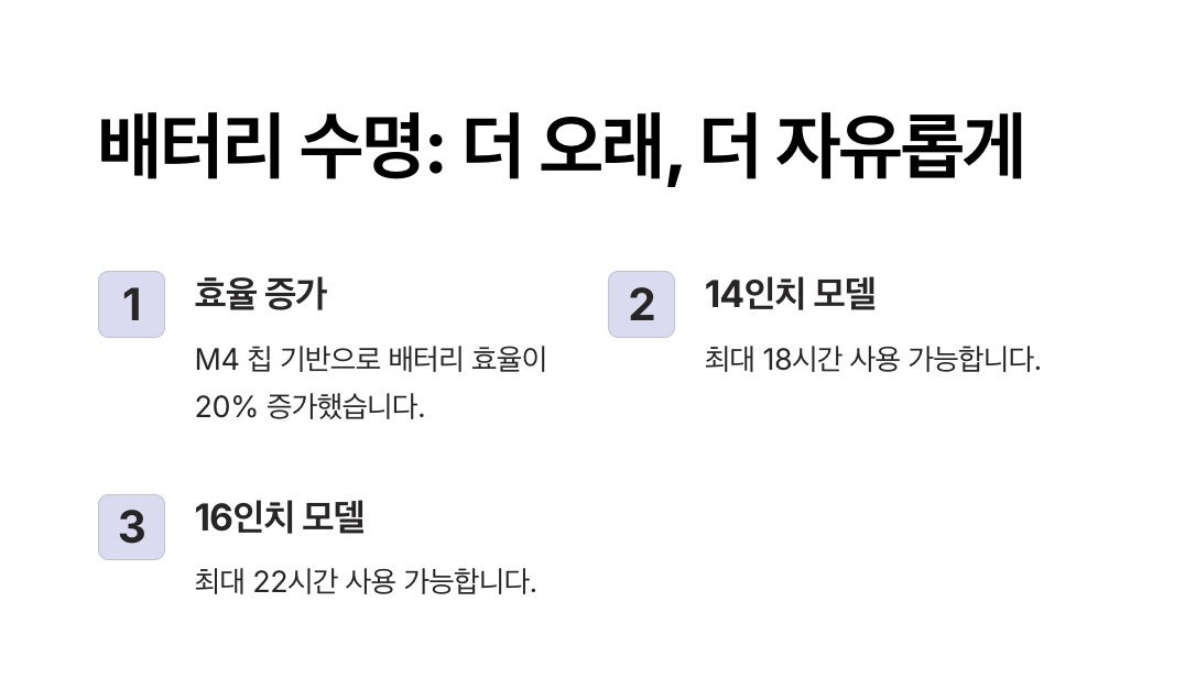 - M4 칩은 전력 소모를 줄이는 고효율 아키텍처를 채택하여 이전 모델 대비 약 20% 이상 배터리 사용 시간이 연장되었습니다.
