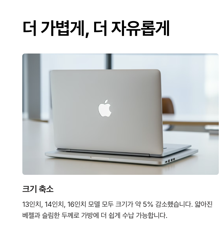 맥북 프로 M4는 이전 모델보다 더 가볍고 작아져 휴대성이 대폭 개선되었습니다. 특히 얇아진 크기와 경량화된 디자인은 장거리 이동이나 외부 작업에서 탁월한 이동성을 제공합니다.
