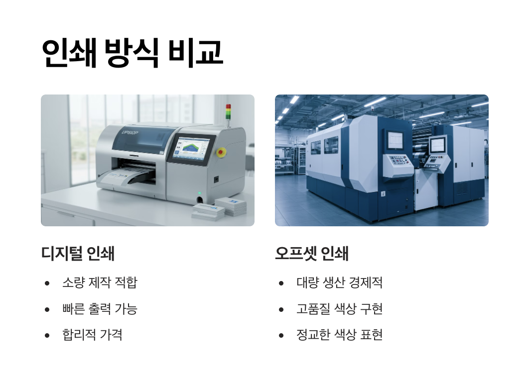 - 오프셋 인쇄: 대량 인쇄(1,000장 이상)에 적합하며, 색상 표현이 정확하고 품질이 우수함.