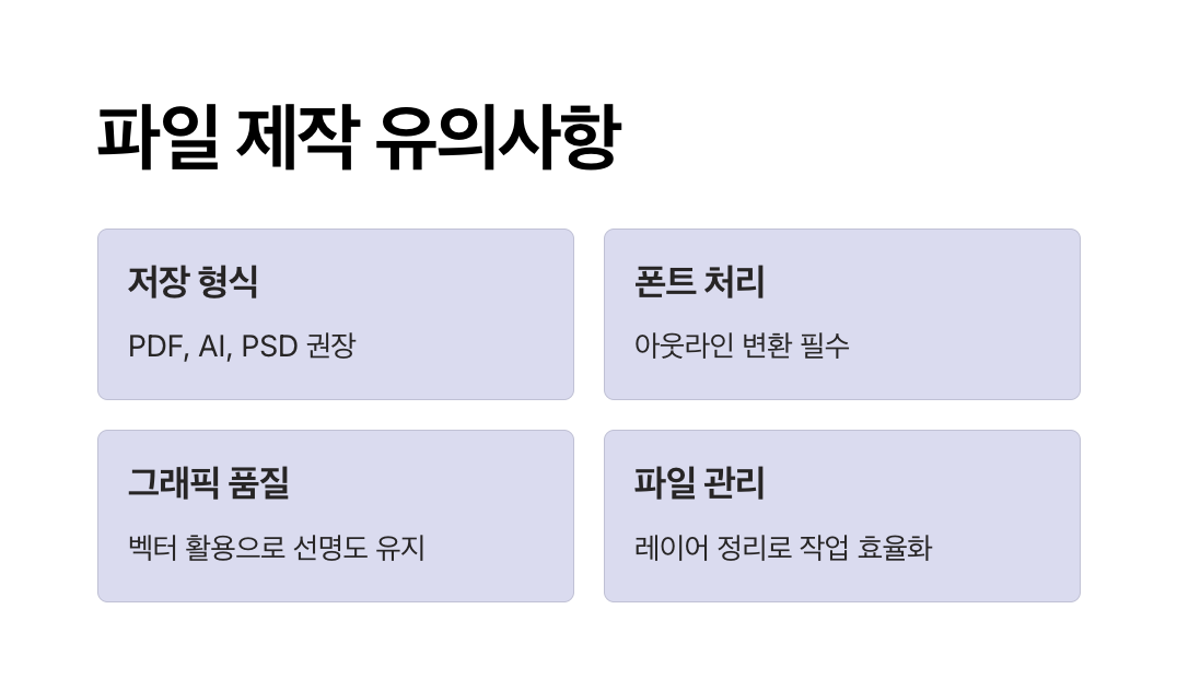 - JPEG, PNG 파일은 인쇄 시 품질 저하 가능성이 있으므로 고해상도로 저장 필요