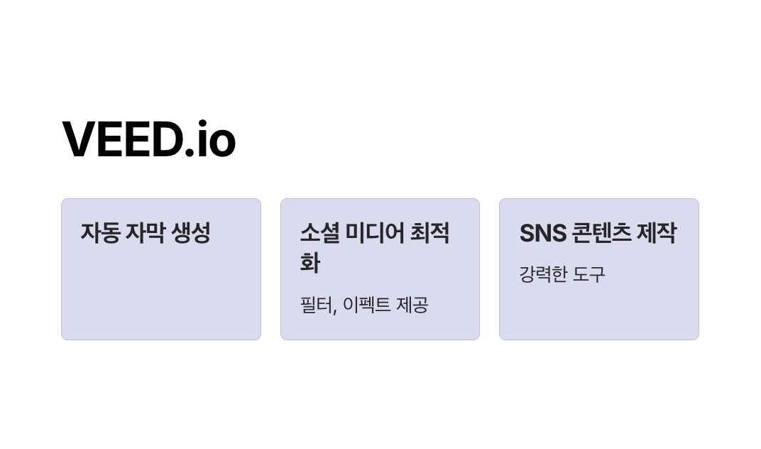 | 5. VEED.io 공식 웹사이트 | 자막 자동 생성과 소셜 미디어 최적화 기능을 제공하는 편집 사이트로, 짧은 영상 콘텐츠 제작자들에게 추천됩니다. |