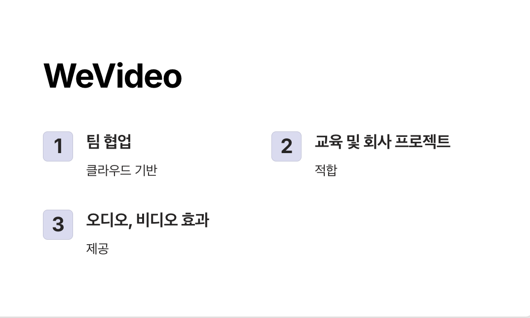 | 4. WeVideo 공식 웹사이트 | 클라우드 기반으로 팀 단위 협업이 가능하며, 학교 및 회사의 프로젝트 영상 제작에 적합합니다. 무료 버전에서도 기본적인 편집이 가능합니다. |
