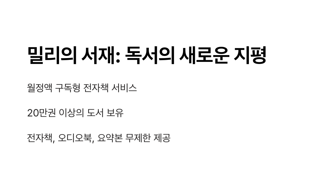 💡 결론: 밀리의 서재는 경제성과 편리함을 모두 충족시키는 구독형 전자책 서비스로, 특히 다양한 포맷의 콘텐츠를 원하는 사용자들에게 적합합니다.