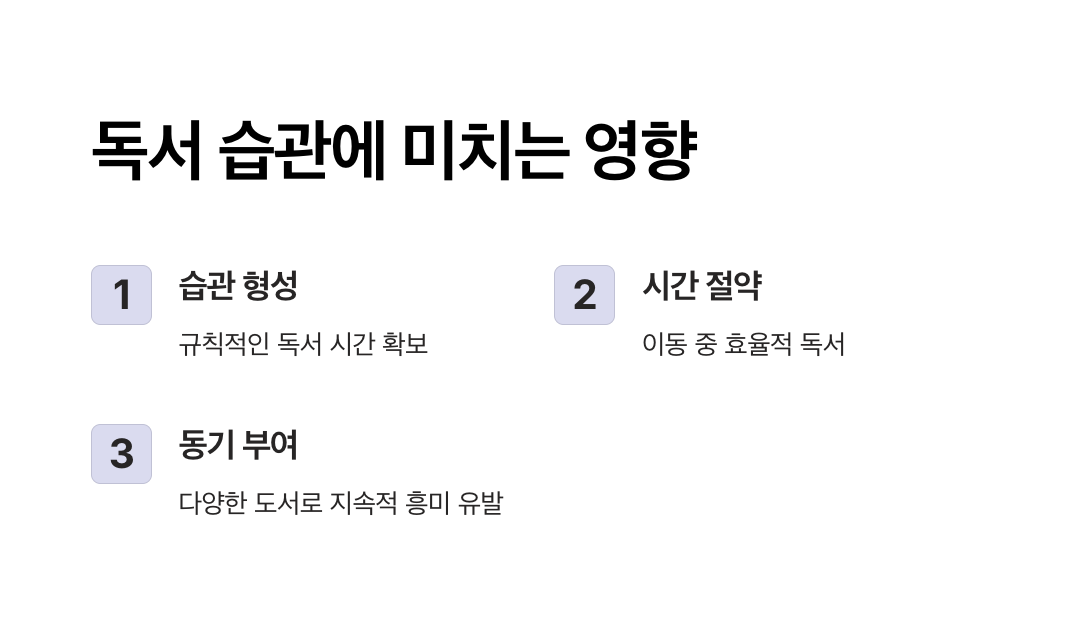 - 오디오북: 귀로 들으면서 독서를 할 수 있어 이동 중에도 효과적입니다.