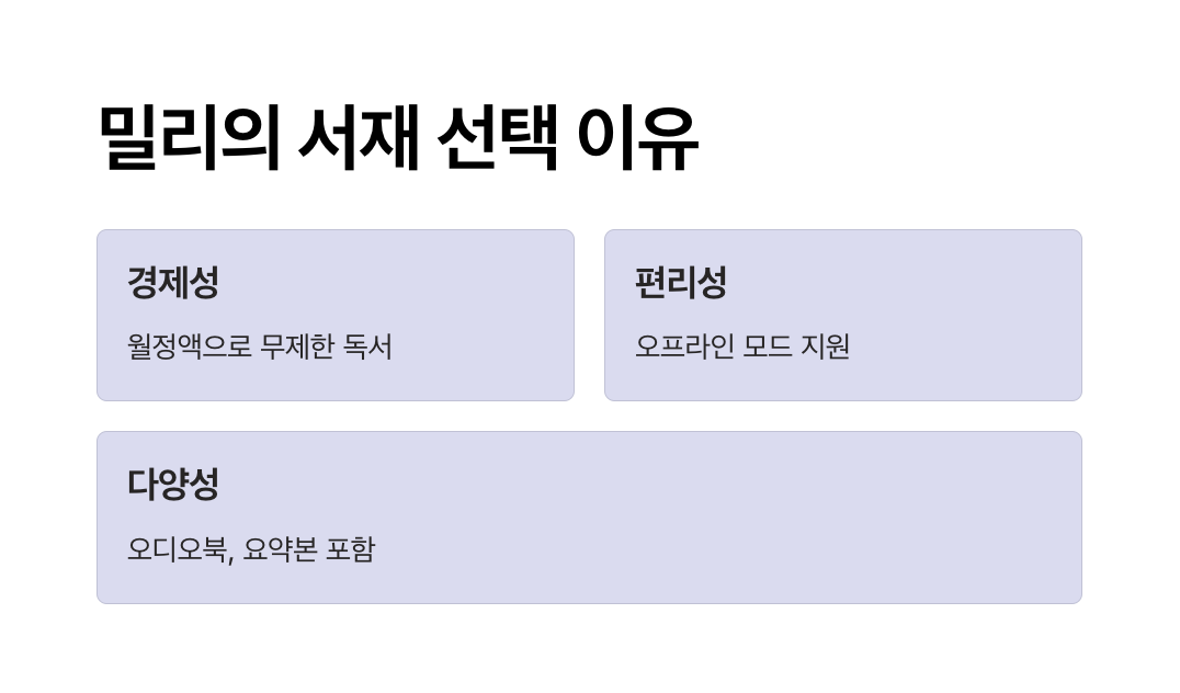 💡 비교 포인트: 밀리의 서재는 월정액 구독료 하나로 모든 콘텐츠를 자유롭게 이용할 수 있어 경제적입니다.