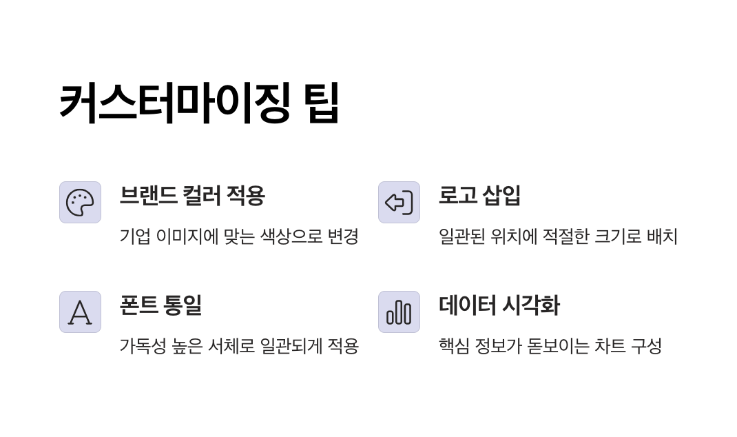| 컬러톤 일관성 | 브랜드 컬러 또는 중립적 톤이 안정감 전달 | IR, 전략 발표 |