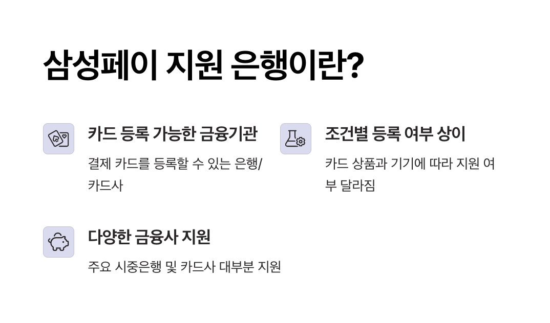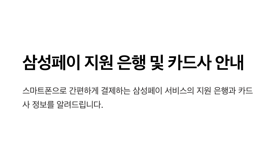 | 확인 방법 | 삼성페이 앱 > 더보기 > 지원 카드 및 은행 항목에서 확인 |