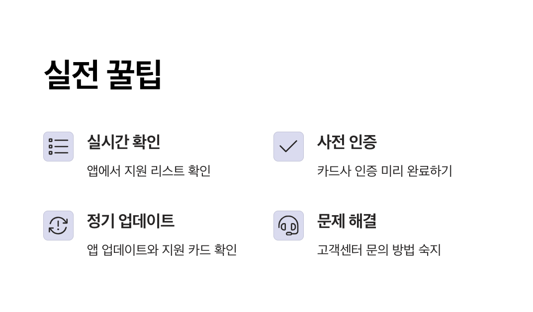 - 카드사 앱에서 사전 인증 설정을 완료해두는 것이 등록 성공률을 높여줍니다.