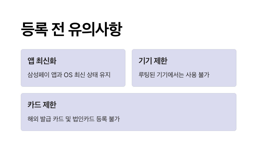 중요 포인트: 삼성페이 등록 가능 여부는 카드사 + 카드 종류 + 발급 국가 + 사용 기기 상태(루팅 여부 등)에 따라 달라집니다.