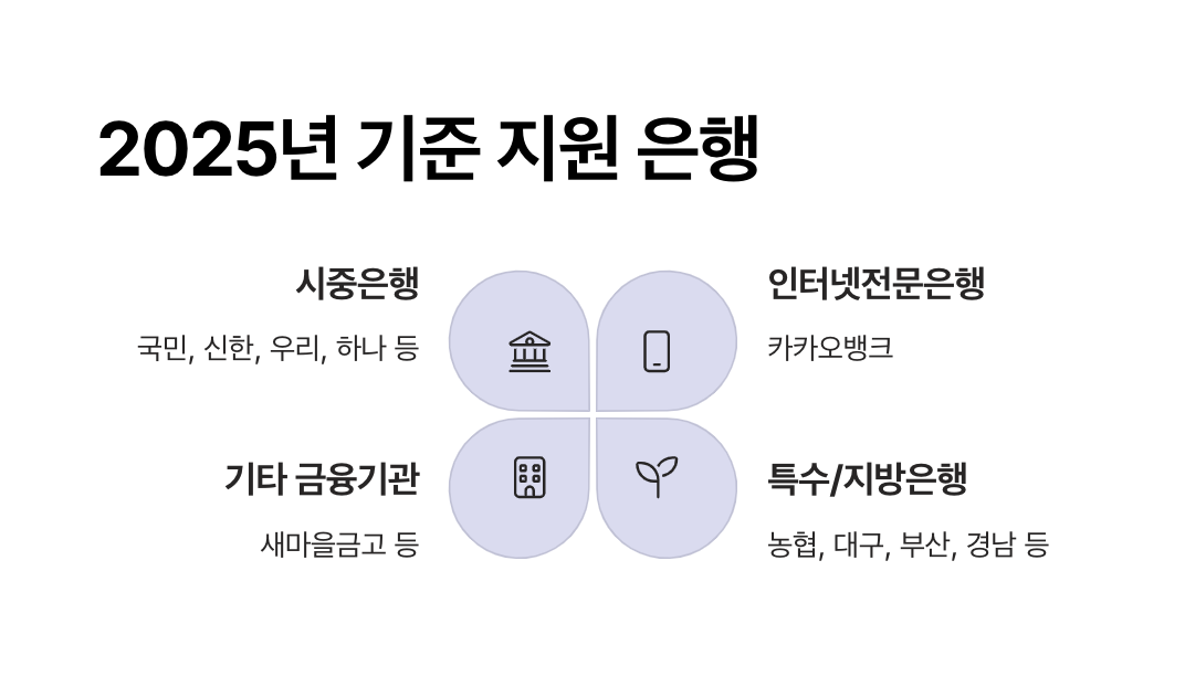 | 특수은행 및 기타 | NH농협은행, 새마을금고, 우체국, 수협은행, 신협 | 일부 선불/기프트카드 제외 |