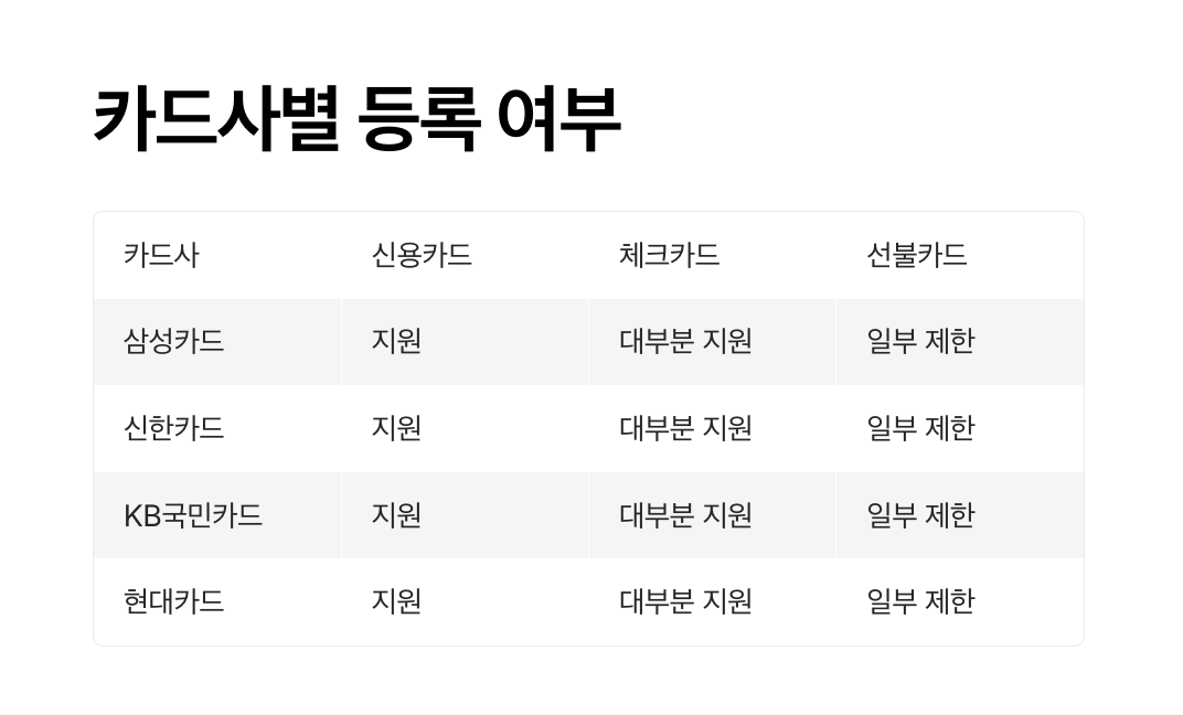 - 카드사, 은행별 등록 가능 여부, 지원 카드 종류 확인 가능