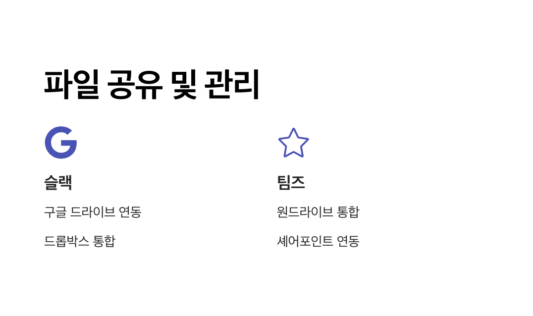 | 파일 저장 용량 | 5GB 팀당 제공 | 사용자당 10GB 이상 | 2GB 사용자당 | 1TB 이상 |