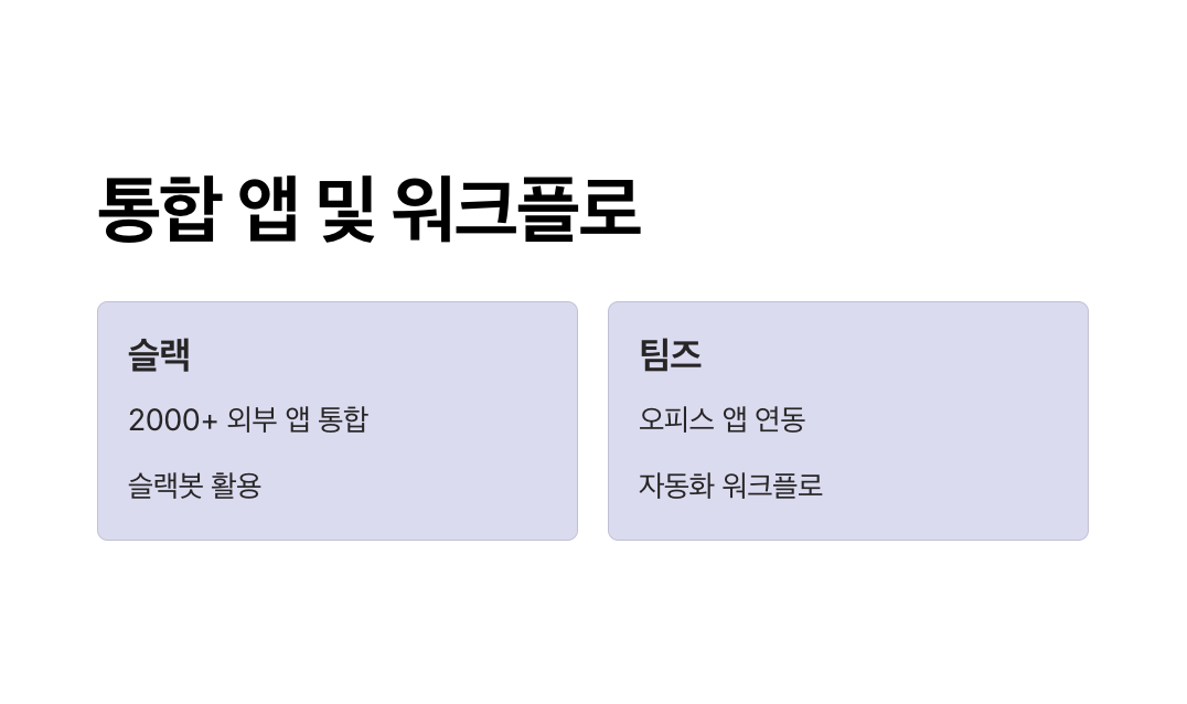 슬랙은 약 2000개 이상의 외부 앱과의 통합을 지원하여 팀의 필요에 맞는 워크플로를 구성할 수 있습니다. 대표적으로 트렐로, 아사나, 지라와 같은 프로젝트 관리 도구뿐만 아니라, 깃허브와 연동하여 개발자 협업에도 유용합니다. 슬랙봇(Slackbot)을 사용하면 미리 설정한 알림, 자동화된 리마인더 등을 통해 효율적인 작업 환경을 만들 수 있습니다. - 마이크로소프트 팀즈: