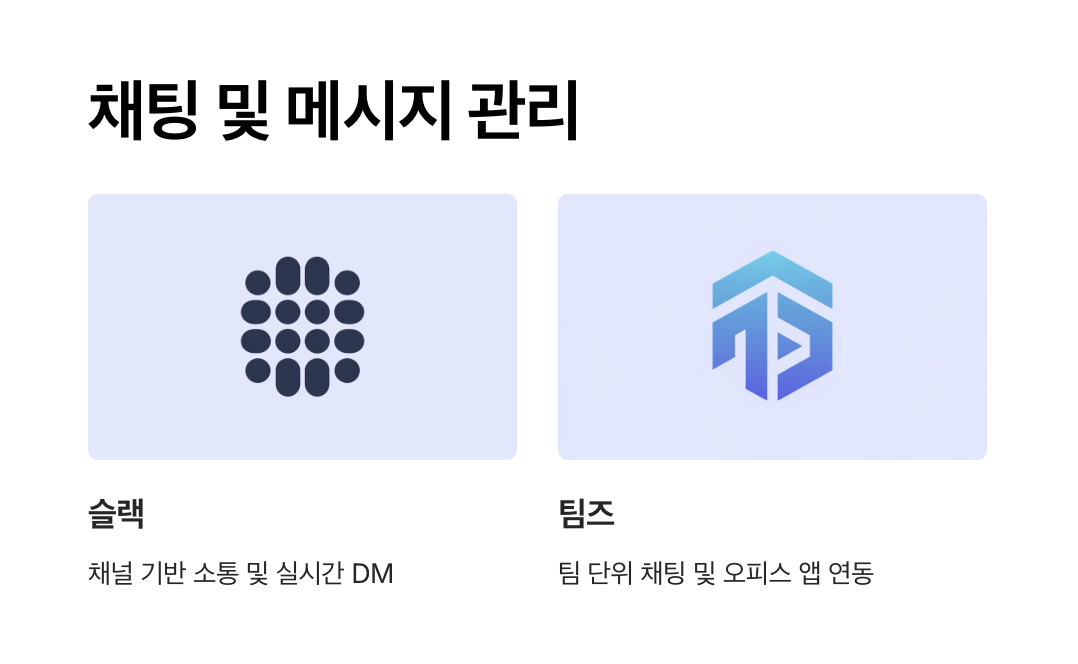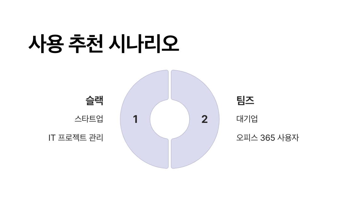 슬랙은 소규모 팀과 스타트업에 최적화된 빠르고 유연한 커뮤니케이션 환경을 제공합니다. 다양한 외부 앱과의 통합도 뛰어나 프로젝트 관리나 실시간 소통이 중요한 팀에서 특히 큰 장점을 발휘합니다. 반면, 마이크로소프트 팀즈는 대규모 조직과 오피스 생태계에 최적화된 도구로, 이메일, 일정 관리, 비디오 회의 등 업무 전반을 통합적으로 관리하는 데 강점을 보입니다.