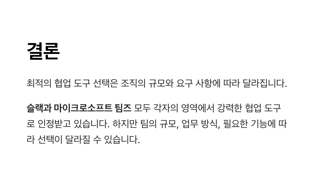 결론적으로, 슬랙과 마이크로소프트 팀즈 모두 각자의 영역에서 강력한 협업 도구로 인정받고 있습니다. 하지만 팀의 규모, 업무 방식, 필요한 기능에 따라 선택이 달라질 수 있습니다.