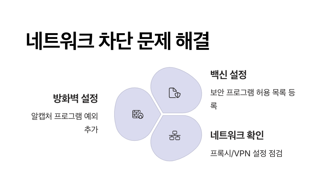 이 오류는 Windows 방화벽 또는 보안 소프트웨어가 알캡처의 네트워크 연결을 차단한 경우 발생할 수 있습니다.