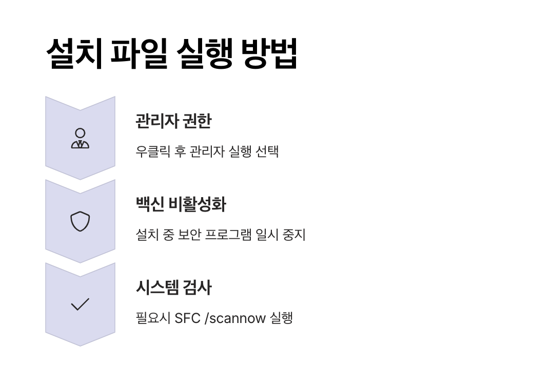 - 시스템 보안 설정으로 인해 일부 프로그램이 자동으로 차단될 수 있으므로 관리자 권한으로 실행하면 정상적으로 설치할 수 있습니다.