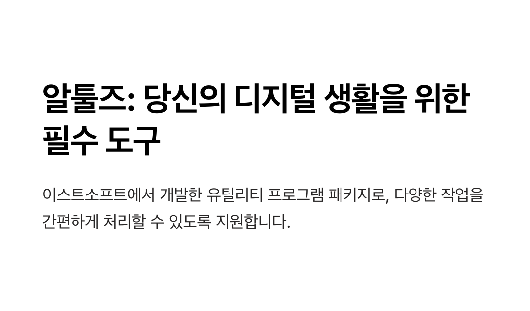 | 4. 이스트소프트 기업 공식 사이트 | 알툴즈를 포함한 다양한 소프트웨어를 개발하는 이스트소프트의 공식 웹사이트로, 기업용 소프트웨어 솔루션 정보도 확인할 수 있습니다. |