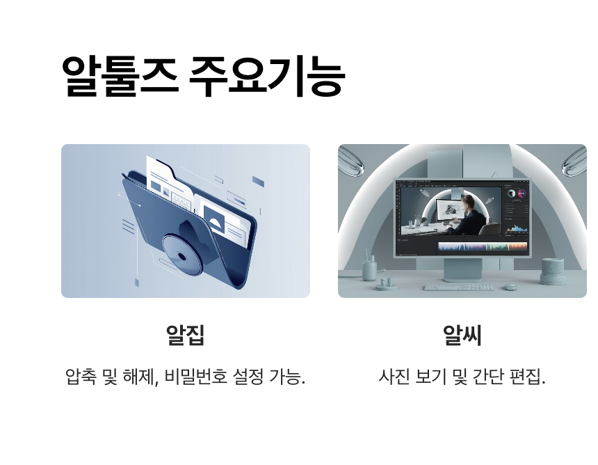 - 편리함: 알툴즈는 PC에서 자주 사용하는 기능들을 하나의 패키지로 제공하여, 다양한 작업을 빠르게 처리할 수 있습니다.