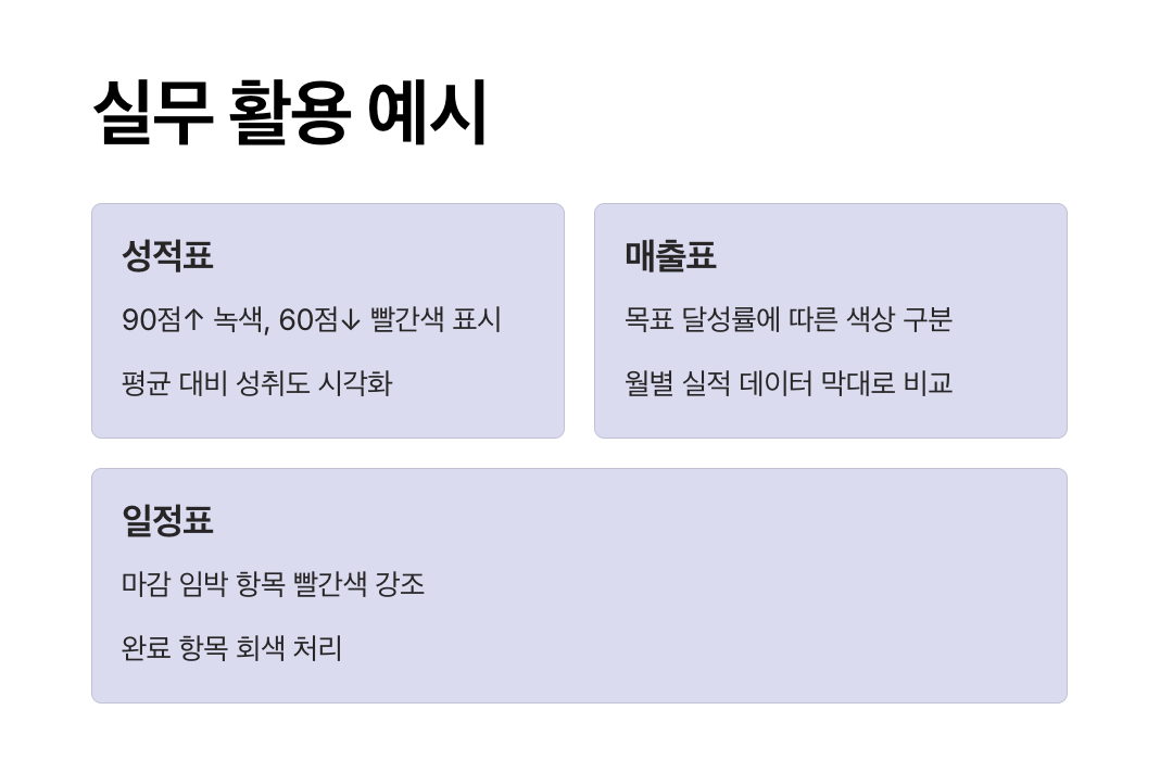 숫자나 글자의 조건에 따라 셀 색상 자동 변경, 이상값 강조, 일정 강조까지 가능해지면, 보고서 작성이나 자료 분석 속도가 훨씬 빨라집니다.