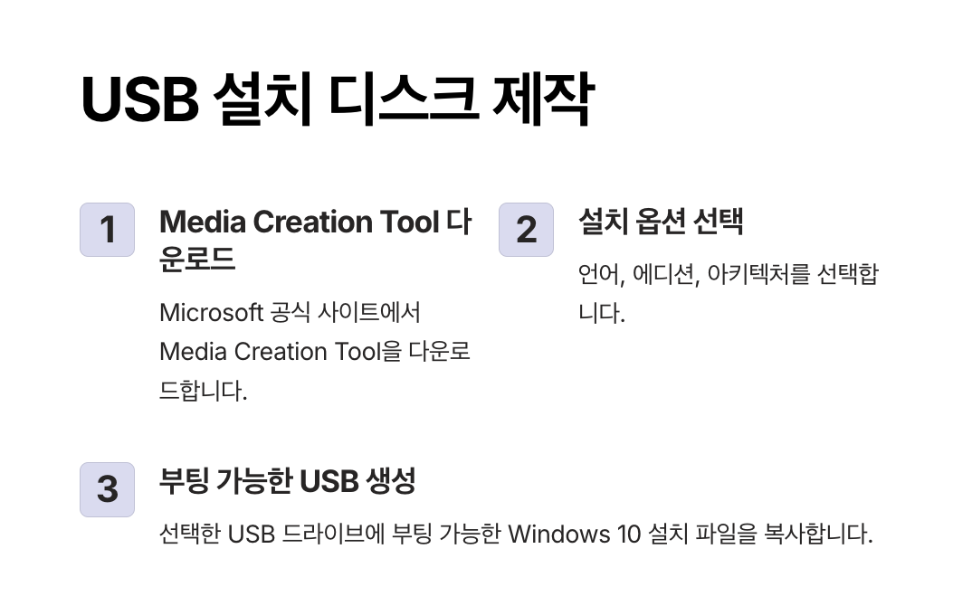 - 파일 형식: Media Creation Tool을 통해 설치 파일을 생성합니다.