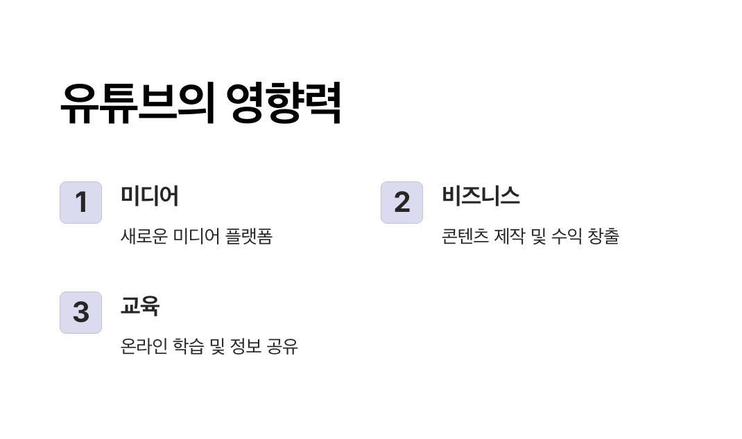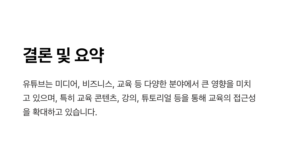 - 교육: 유튜브는 학습 콘텐츠와 강의 자료를 무료로 제공하며, 교육 접근성을 크게 확대했습니다. 이를 통해 학생, 전문가, 일반인들이 언제 어디서나 지식을 습득할 수 있는 환경을 지원합니다.