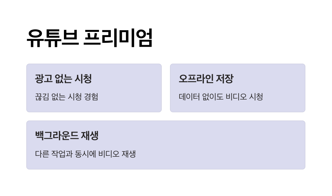 | 2. 유튜브 프리미엄 정보 페이지 | 광고 없는 동영상 시청, 오프라인 저장, 백그라운드 재생 등의 기능을 제공하는 유튜브 프리미엄 서비스에 대한 상세 정보와 가입 방법을 확인할 수 있습니다. |