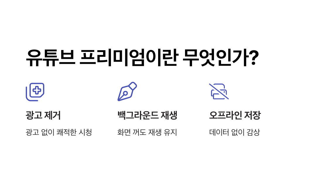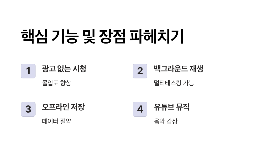 유튜브 프리미엄은 광고 없이 동영상을 시청하고, 백그라운드 재생과 오프라인 저장이 가능하다는 점에서 확실한 장점이 있습니다. 또한, 유튜브 뮤직 프리미엄까지 포함되어 있어 음악 감상을 자주 하는 분들에게는 유용할 수 있습니다.