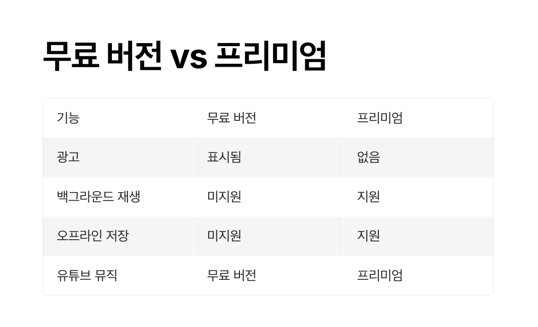 | 기능 | 무료 유튜브 | 유튜브 프리미엄 |