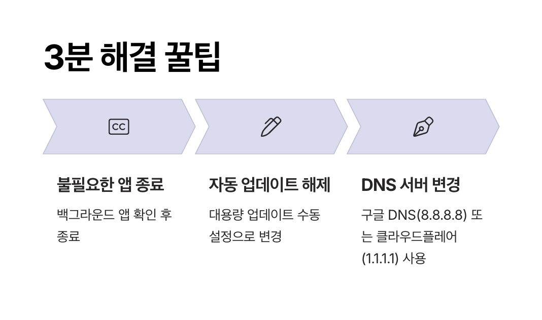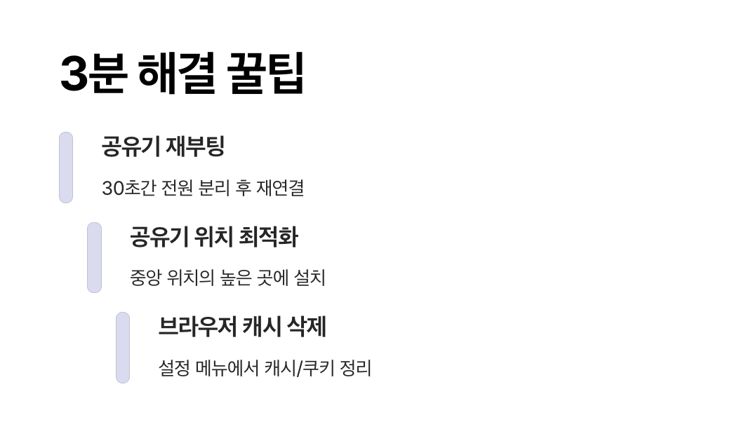 지금 바로 할 수 있는 간단한 조치만으로도 인터넷 속도 느림 해결법이 될 수 있습니다. 아래 다섯 가지 방법은 실제로 많은 사용자가 효과를 본 실전 꿀팁입니다.