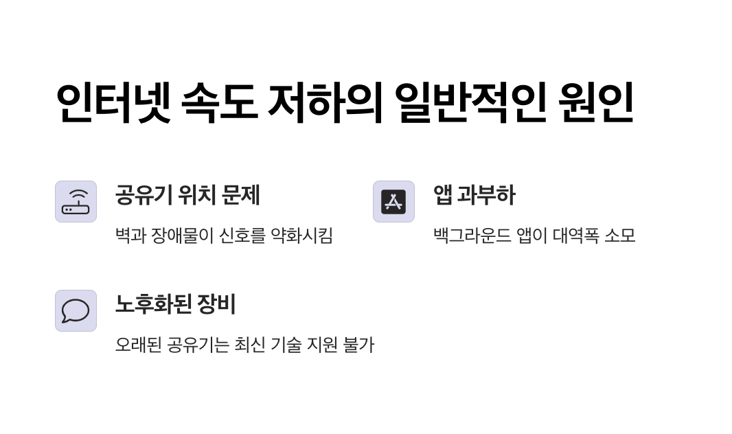 인터넷 속도 저하는 갑자기 발생하는 경우가 많지만, 대부분은 반복적으로 나타나는 몇 가지 원인에서 비롯됩니다. 아래 항목들을 점검해보면 문제 해결의 실마리를 쉽게 찾을 수 있습니다.