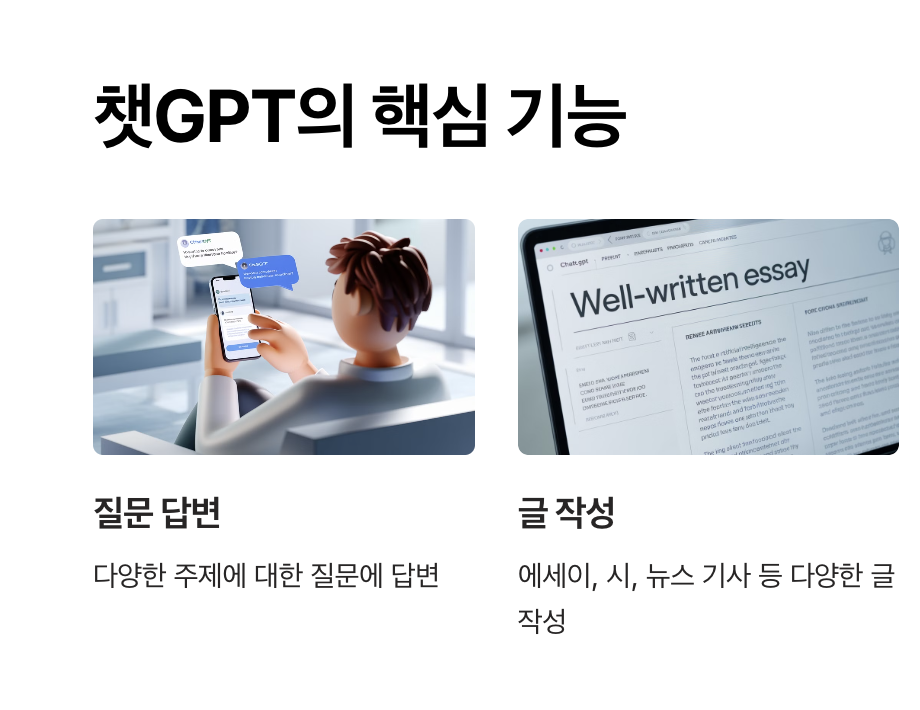 - 챗GPT는 사전, 백과사전, 뉴스 기사 등 다양한 정보의 소스를 기반으로 질문에 대해 신속하고 명확한 답변을 제공합니다.