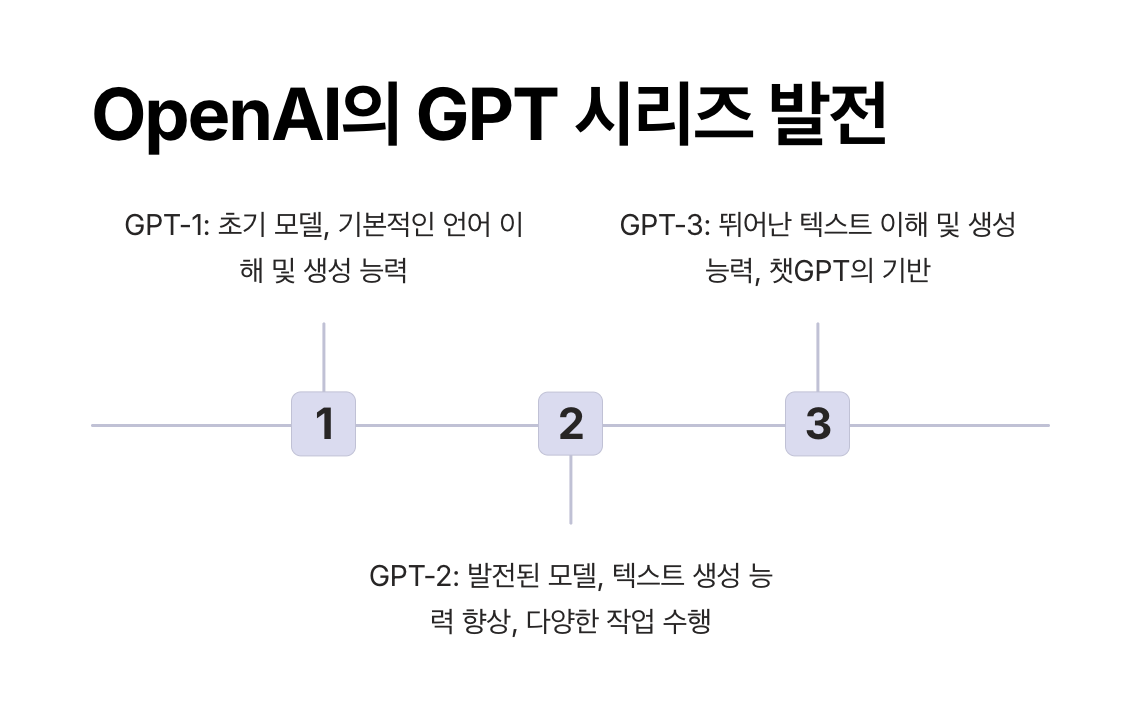 - 챗GPT는 GPT 시리즈(1세대, 2세대, 3세대, 그리고 최신인 GPT-4)로 발전해오며 점점 더 자연스러운 대화와 고도화된 텍스트 이해 능력을 보여줍니다.