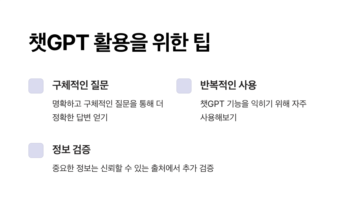 - 챗GPT는 질문이 구체적일수록 더 나은 답변을 제공합니다. 예를 들어, "날씨가 어떤가요?"보다는 "서울의 오늘 날씨는 어떤가요?"처럼 질문하세요.