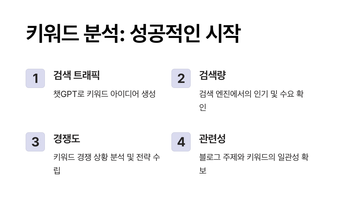 | 경쟁도 | 경쟁이 너무 높은 키워드는 피하고, 적당한 경쟁도를 가진 키워드를 선택합니다. |