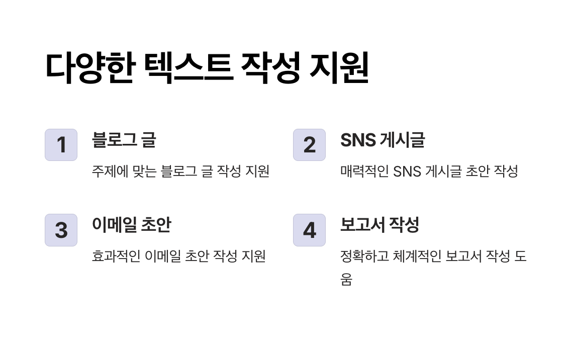 챗GPT는 다양한 형태의 텍스트 콘텐츠를 생성하는 데 강점을 가지고 있습니다. 블로그 글, 소셜 미디어 게시글, 이메일, 보고서 등 다양한 글쓰기를 지원합니다.
