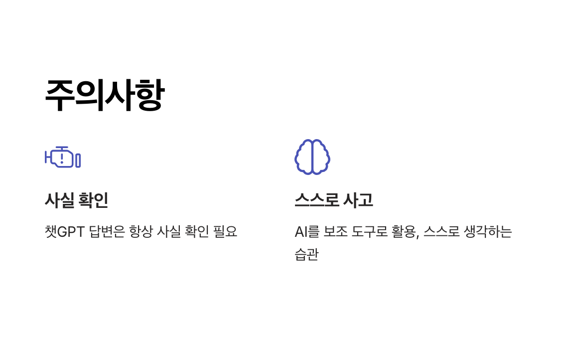 챗GPT는 강력한 도구지만, 무조건적으로 의존하면 학습 능력이 저하될 수 있습니다. AI의 도움은 보조적인 역할로 활용하는 것이 중요합니다.