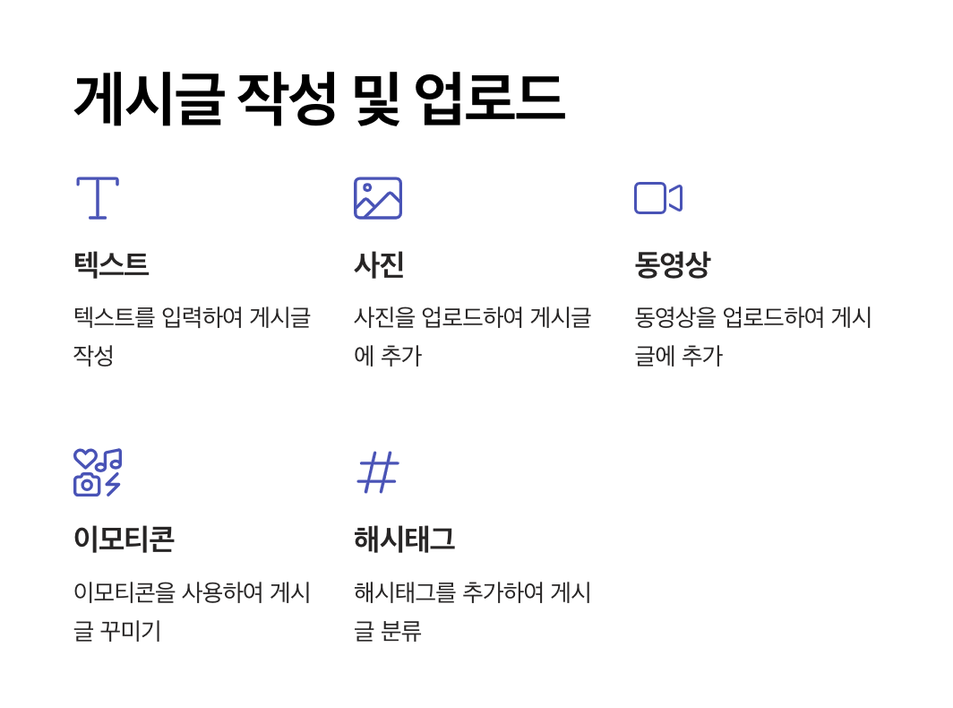 - 텍스트를 입력한 뒤 이모티콘, 해시태그 등을 추가하여 게시글을 꾸밀 수 있습니다.