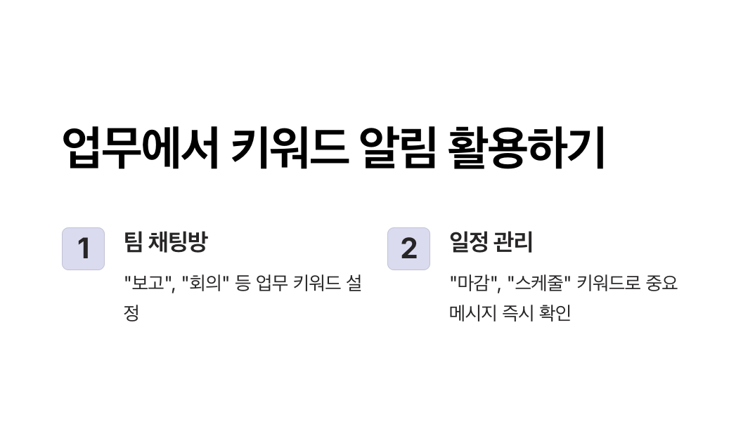 - 업무 채팅방에서 "회의", "마감" 같은 키워드를 설정해 즉각 반응이 필요한 메시지를 놓치지 않습니다.